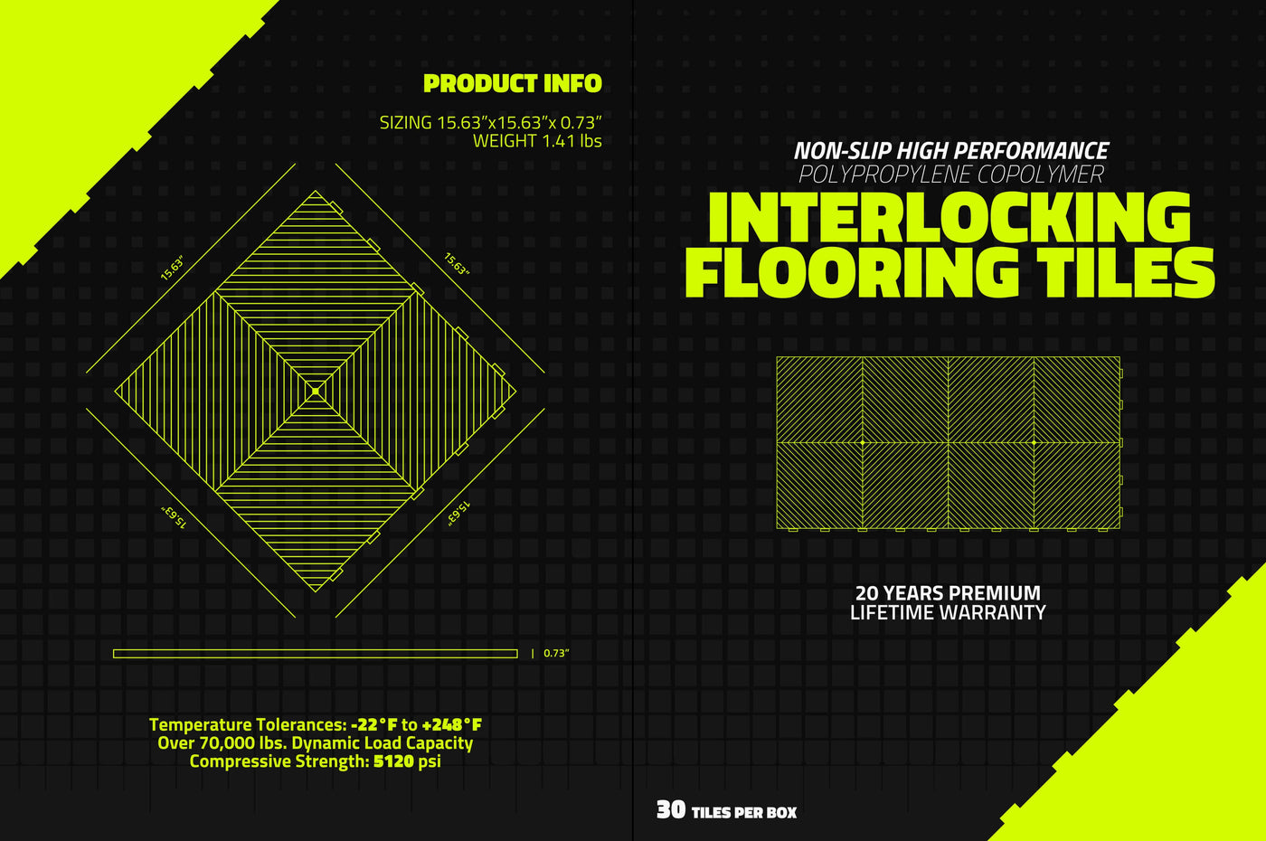 Transform your garage with our Ultimate Interlocking Flooring Tiles, designed for unmatched durability and style. These tiles feature an impressive lifetime warranty of 20 years and can withstand extreme temperature ranges from -22°F to +248° F. With a dynamic load capacity of over 70,000 lbs and a compressive strength of 5120 psi, they offer exceptional performance for any garage setup.